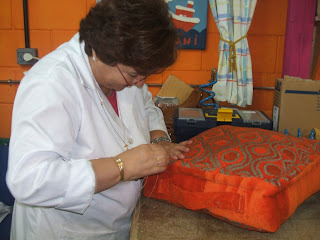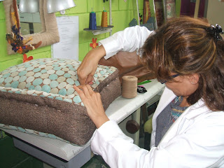 Como vereis en la foto el burlete, que se hace todo alrededor del cojín, se realiza con una aguja curva grande y un hilo que se llama volantin.